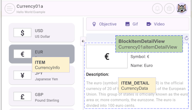 This example illustrates how a Block manages a list of data, coordinating with the interface to display the list and load detailed data based on user selections.