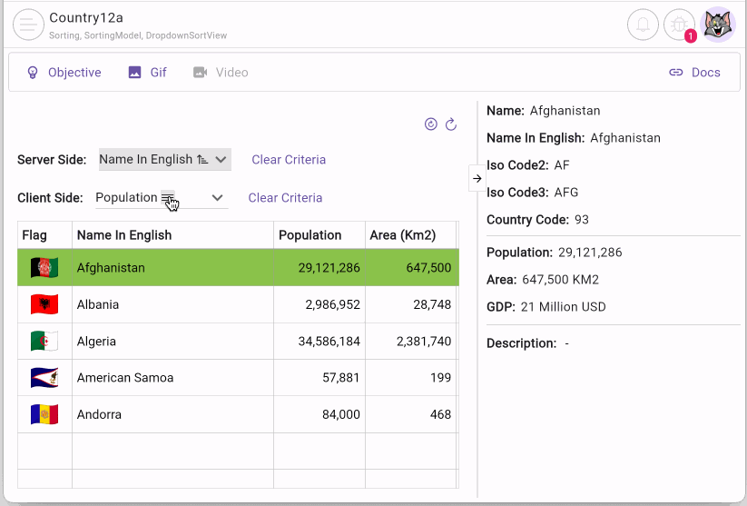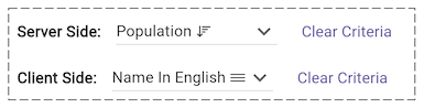 - Đối với phía máy khách, ClientSide-SortModel cung cấp danh sách các tiêu chí cho xắp sếp và quy tắc để so sánh các dữ liệu theo các tiêu chí đó (Các phương thức trừu tượng mà bạn cần phải triển khai của SortModelBuilder). Người dùng có thể lựa chọn các tiêu chí và hướng (direction) cho mỗi tiêu chí trên SortPanel.