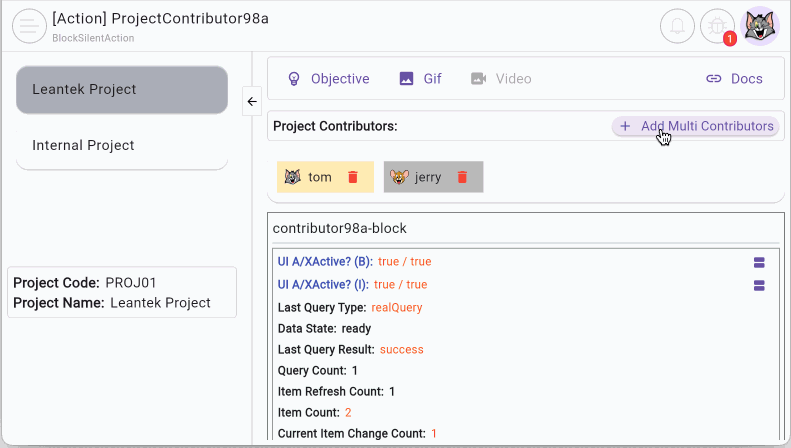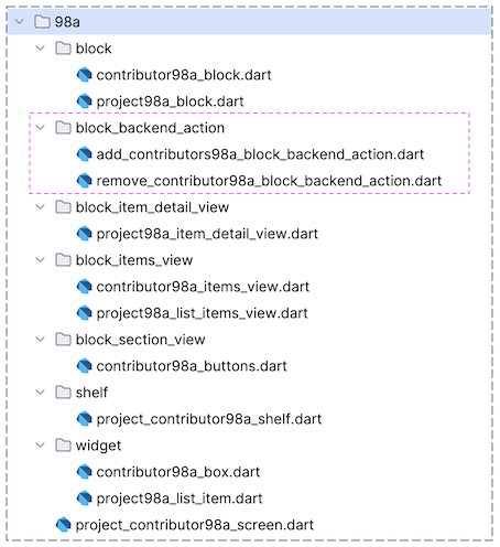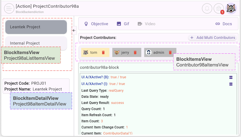 In this example, we have two Block(s): Project98aBlock and Contributor98aBlock, which have a parent-child relationship. Select a project from the list on the left, and you will see a list of contributors on the right. We will create two BlockBackendAction(s) to add and remove contributors from the project.