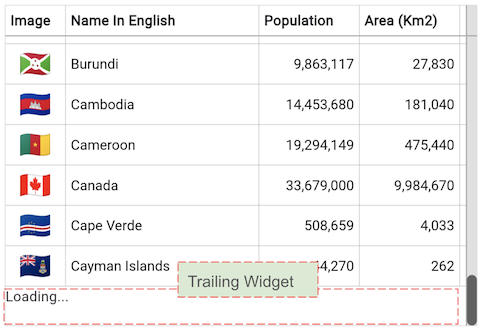When the user scrolls to the last row of the table, a Trailing widget will appear to indicate that the next set of data is being loaded.