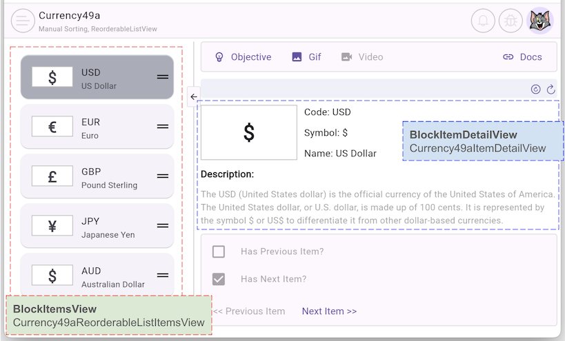 When a user drops an item into a new position, the onReorder event is triggered. Here, we need to update the item's position within the Block's data list.
