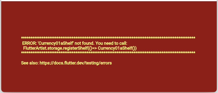 FootballPlayer86aShelf shelf = FlutterArtist.storage.findShelf();If a Shelf is not registered, a runtime error will occur when you attempt to access it. A bright red error screen will appear to alert you.