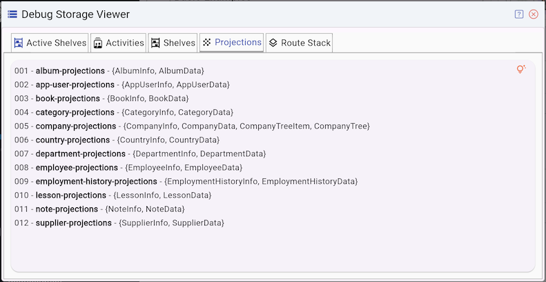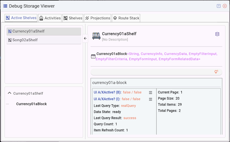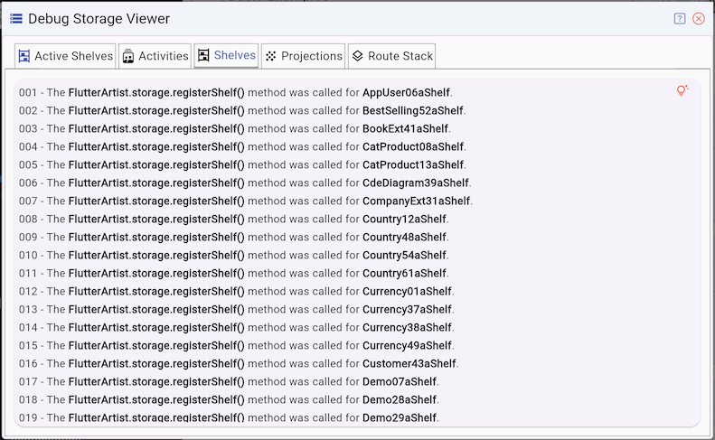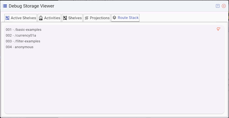 The Active Shelves tab displays a list of currently active Shelf(s). This includes Shelf(s) the user is currently interacting with, as well as historical Shelf(s) that can be revisited using the Back button. Essentially, Active Shelves are Shelf(s)linked to current and historical Route(s). When a Route is removed from the Route Stack, its associated Shelf(s) are also cleared from memory.